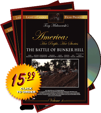 THE BATTLE OF BUNKER HILL, is the first in a series of historic DocuDramas from Light a Candle Films, and Producer/Director Tony Malanowski. This first installment in the series AMERICA: HER PEOPLE, HER STORIES, is designed to teach the History of the United States in a positive, traditional and family-friendly way, while also highlighting the Christian Faith of America's Founding Fathers. Perfect for homeschoolers, children from private schools and independent study. THE BATTLE OF BUNKER HILL is presented on DVD with a 5.1 Dolby Surround Stereo mix and a full symphonic score. Shot on motion picture film for a sharper, crisper picture, this production features epic battle scenes utilizing several American Revolutionary War Reenactor Units and gives the full story of what happened in the hills surrounding Boston Harbor on June 17, 1775. |